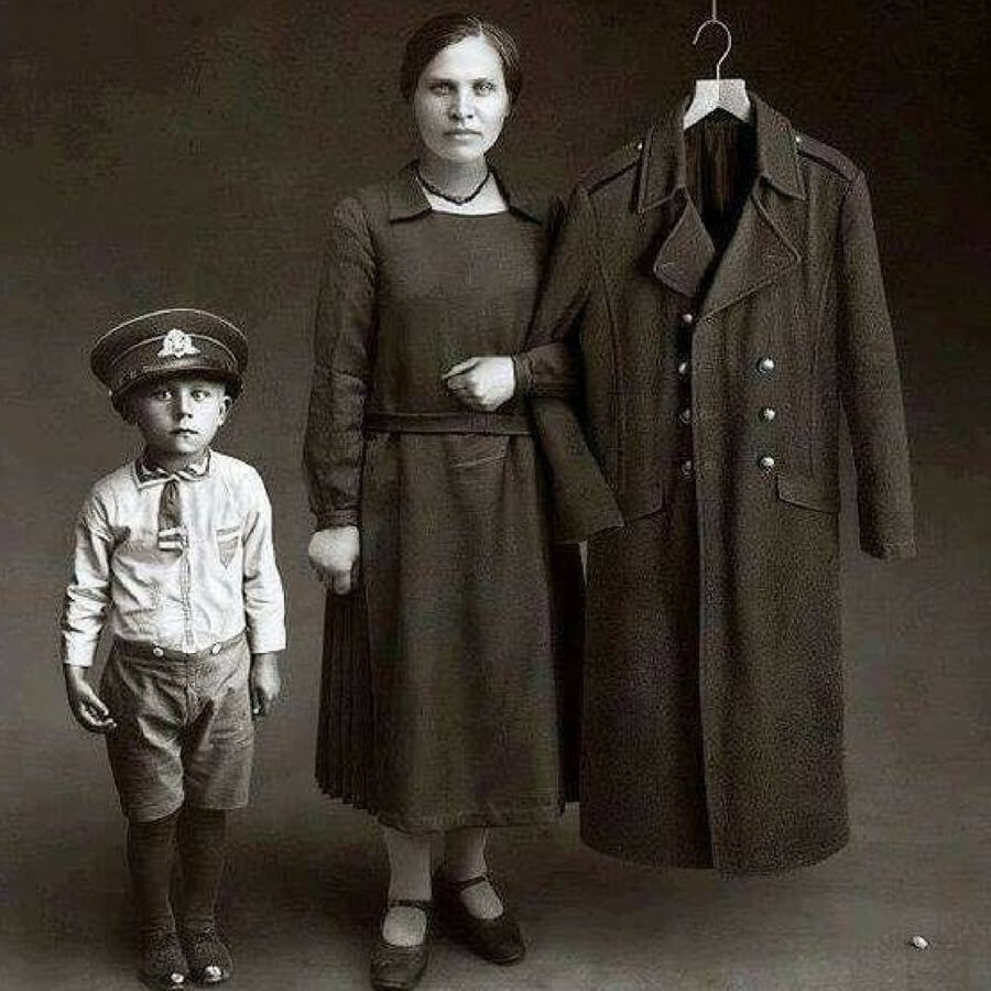 Having a photo taken to honor a loved one who died from war or illness was not uncommon in the 20th-century. This widow and son are standing with the military coat of a husband and father lost to war.