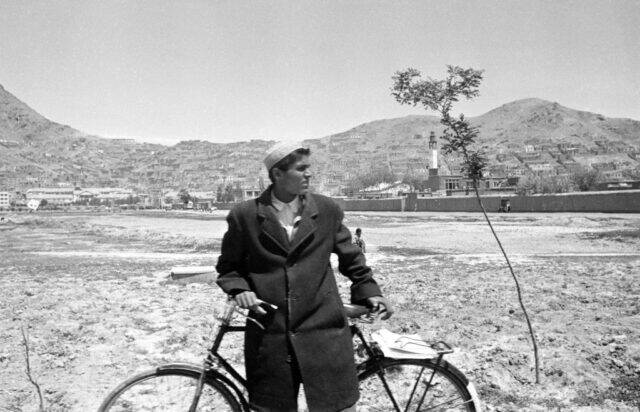 Afghan teenager standing with his bicycle, circa 1968.