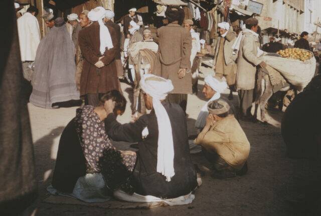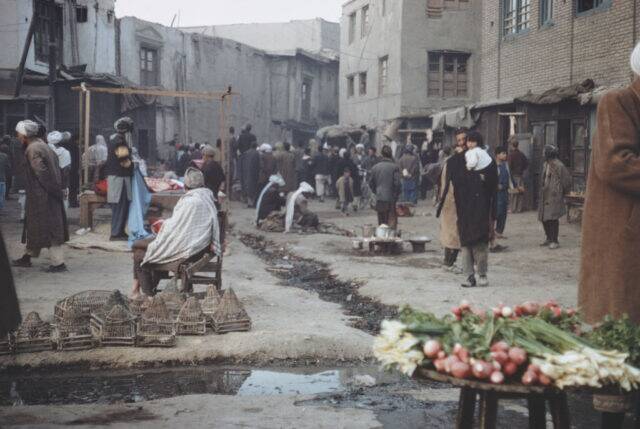 Patrons visiting an open-air market in Afghanistan, circa 1965. Note the open sewer that’s running through the middle of the complex.