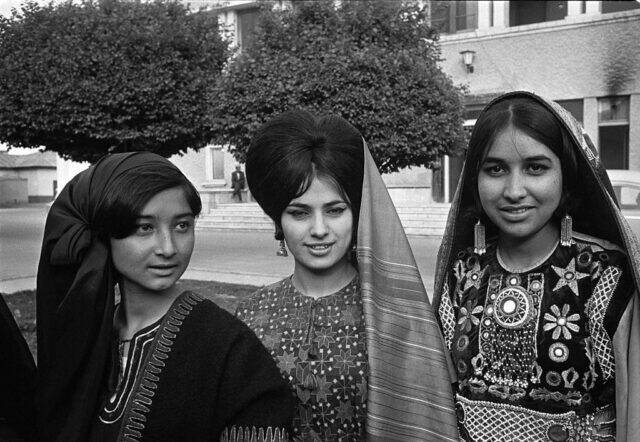Three Afghan women dressed in traditional clothing, circa 1968.