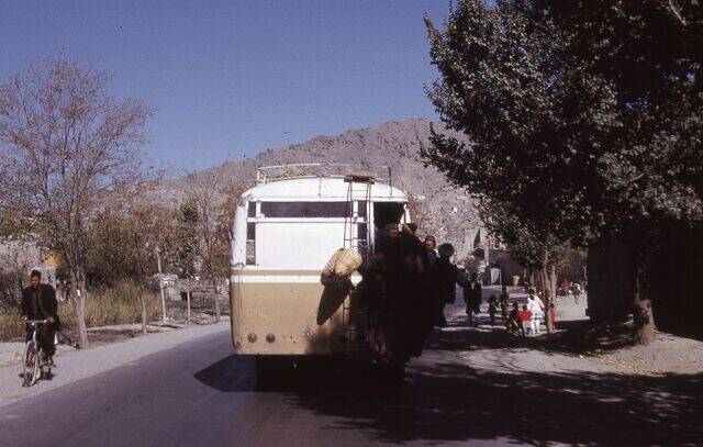 Men hanging out of the back of the bus that’s traveling down a road in Kabul, Afghanistan, circa 1973.