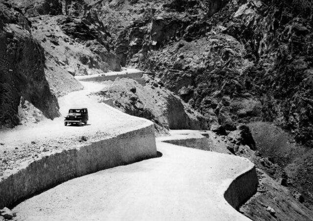 Car driving along the Peshawar-Kabul road stretch in Afghanistan, circa 1960.