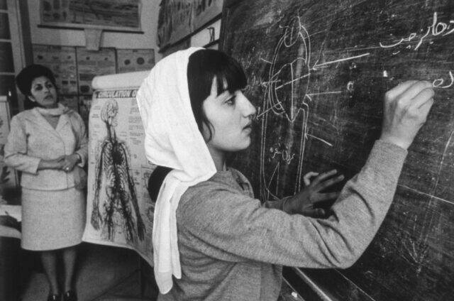 Female student taking a biology class at Malalaï High School in Kabul, Afghanistan, circa 1972. It appears the class is learning about the circulatory system, based on the heart drawn on the blackboard and the diagram of the human circulatory system.