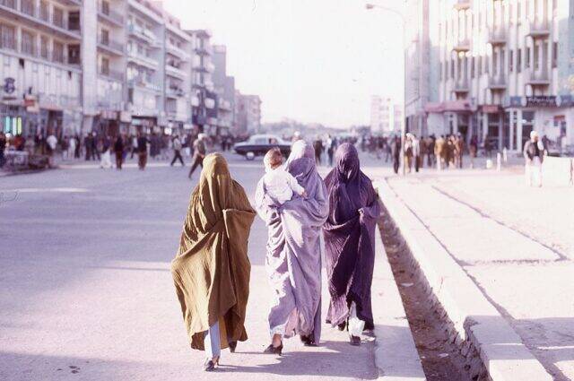 Three women dressed in colorful burkas walking down a street in Kabul, Afghanistan, circa 1973. Note their Western-style slacks and high-heels.