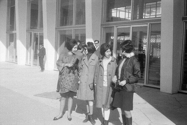 Women donning Western fashion while standing outside of Kabul International Airport in Afghanistan, circa 1967. Each is wearing a different item of clothing that was considered stylish for the time period.