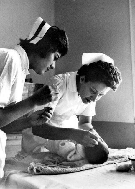 Peace Corps volunteer Dorothy Anne Luketich of Arlington, Virginia (right) and an unidentified woman working as nurses in a hospital in Kabul, Afghanistan, circa 1960s.